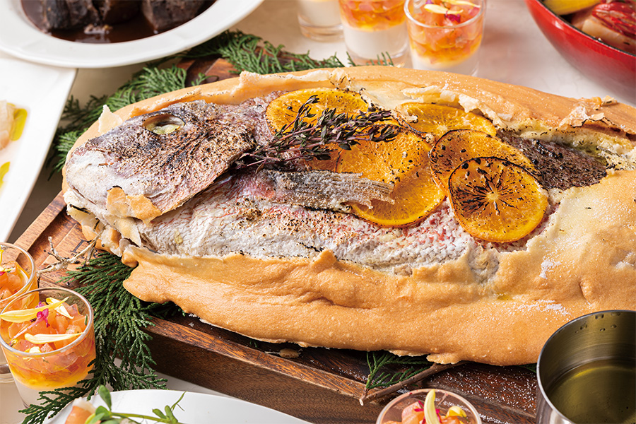 愛媛真鯛の塩釜焼き オレンジオイル トマトとサフランのクーリ