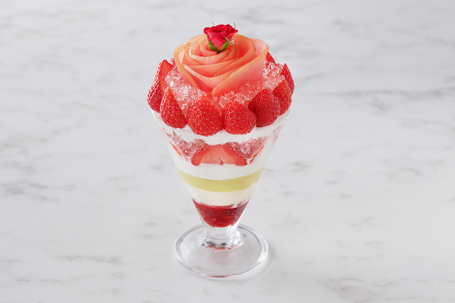 キルシュゼリーと厳選された苺、チョコレートアイスを使用した見た目も華やかなローズパフェをご用意しました。