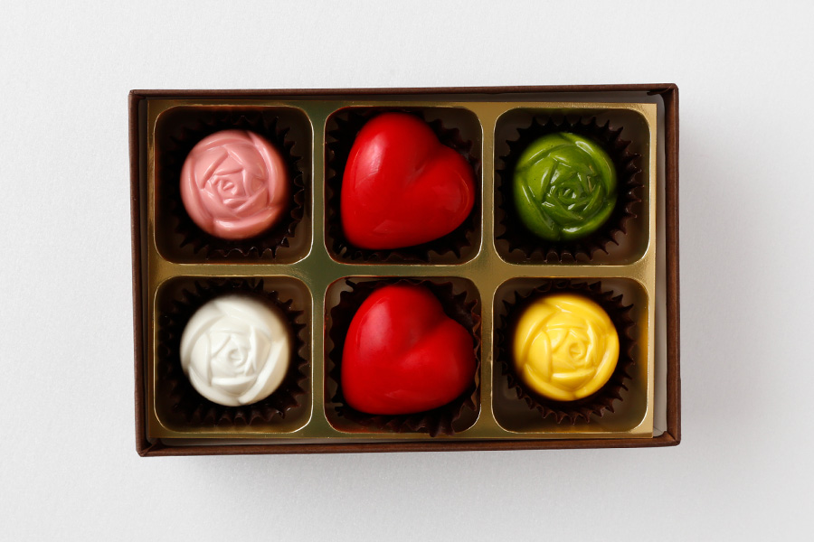 ハートとバラをかたどったボンボンショコラ。中国茶や紅茶、日本茶やコーヒーはもちろん、アルコールにも合う味わい。素材の風味や食感にあわせて計算された、くちどけをお愉しみ下さい。