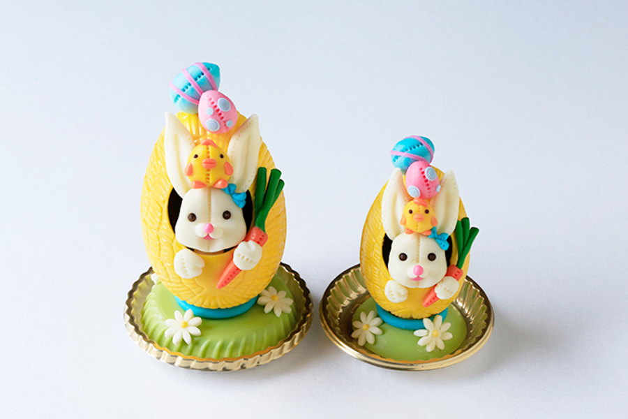 エッグチョコレートから覗いているのは可愛らしいウサギとヒヨコのコンビ。中にはキャラメリゼしたアーモンドをチョコレートでコーティングしたアマンドショコラを詰め込んだイースターエッグをご用意いたしました。