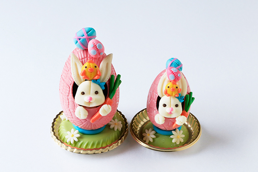 エッグチョコレートから覗いているのは可愛らしいウサギとヒヨコのコンビ。中にはキャラメリゼしたアーモンドをチョコレートでコーティングしたアマンドショコラを詰め込んだイースターエッグをご用意いたしました。